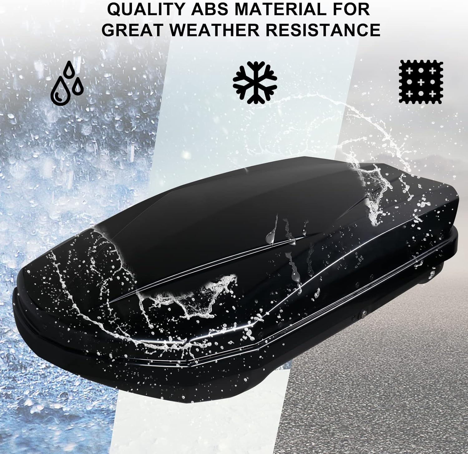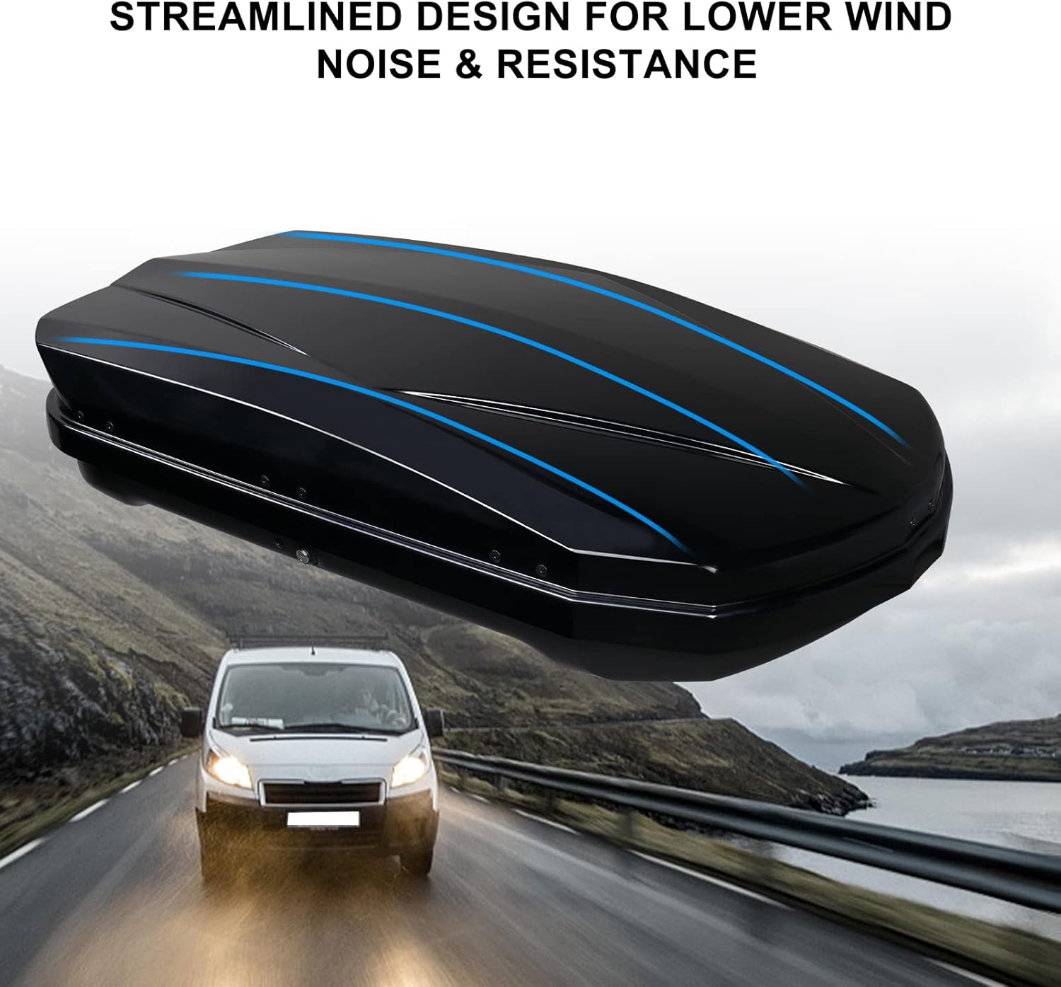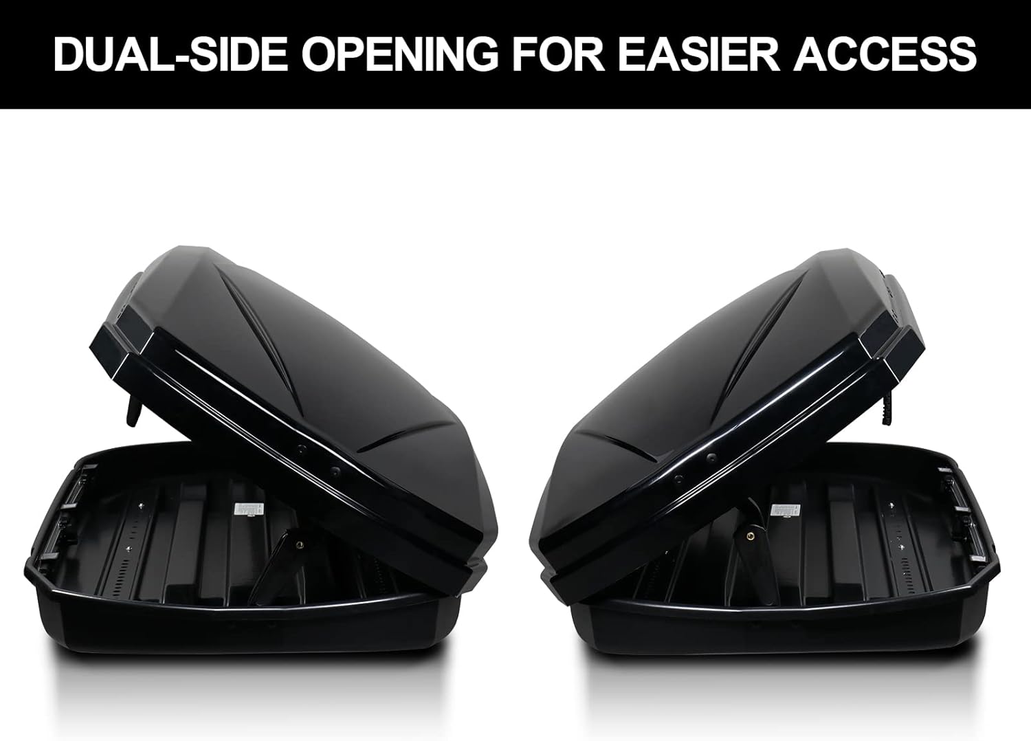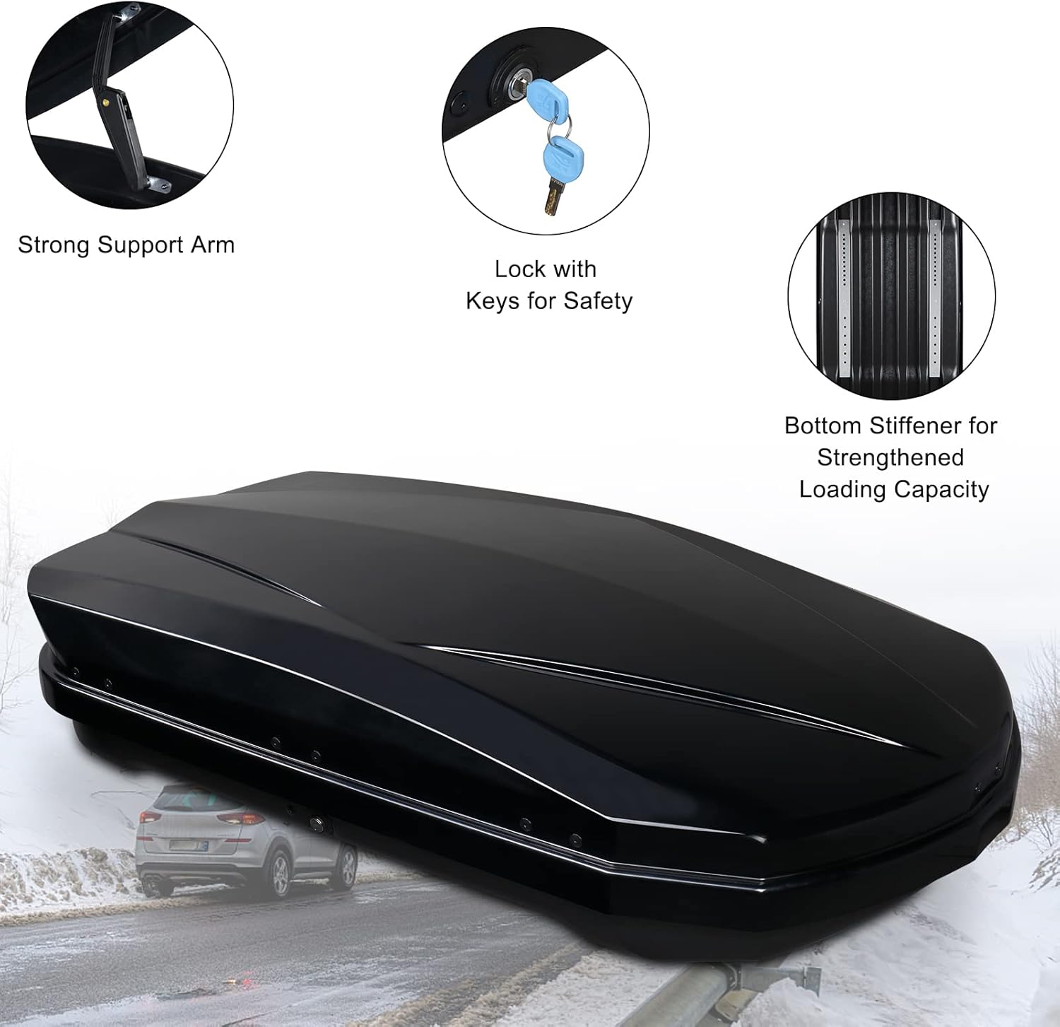 - LOCKING SYSTEM FOR SAFETY: It is designed with locks on both sides and comes with keys for protecting your valuables. And the stiffeners at the bottom of the roof cargo box strengthen its stability.
